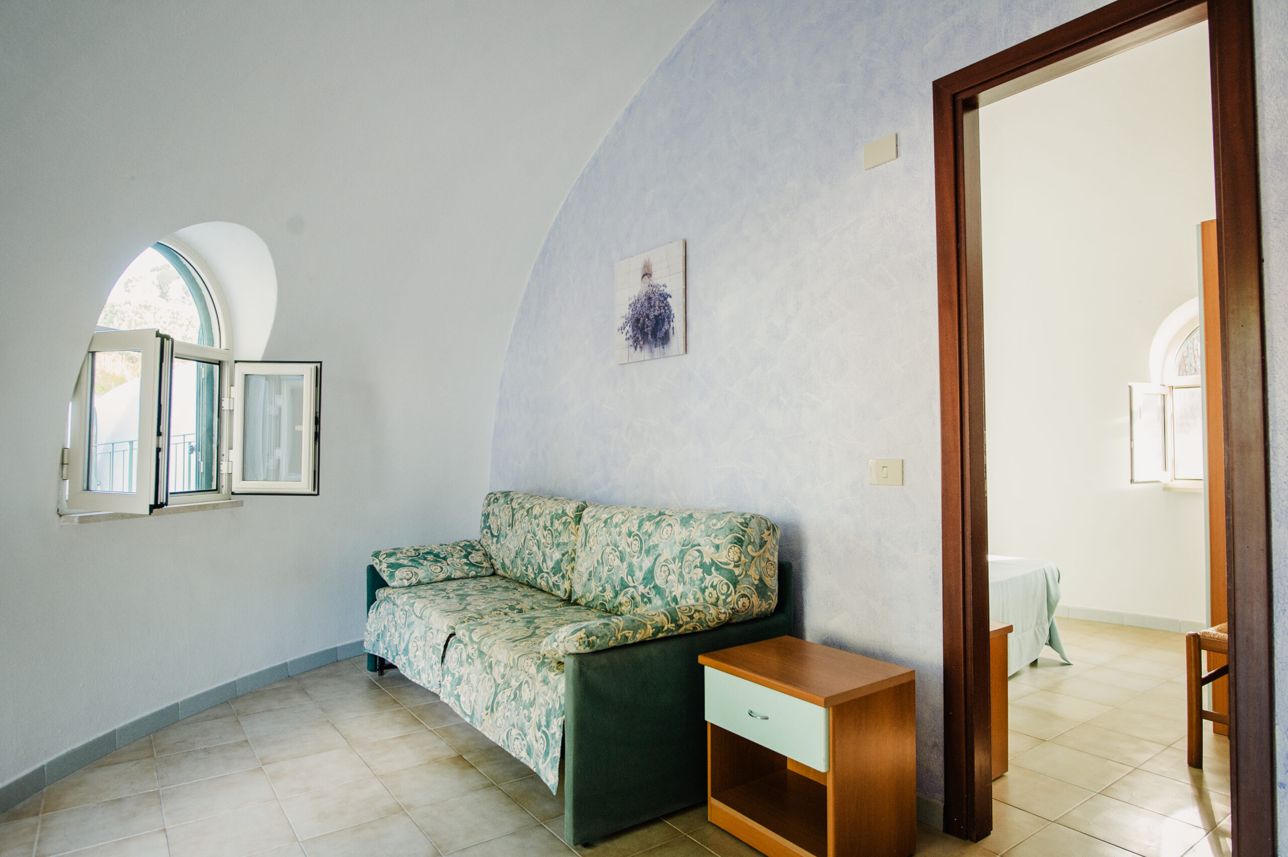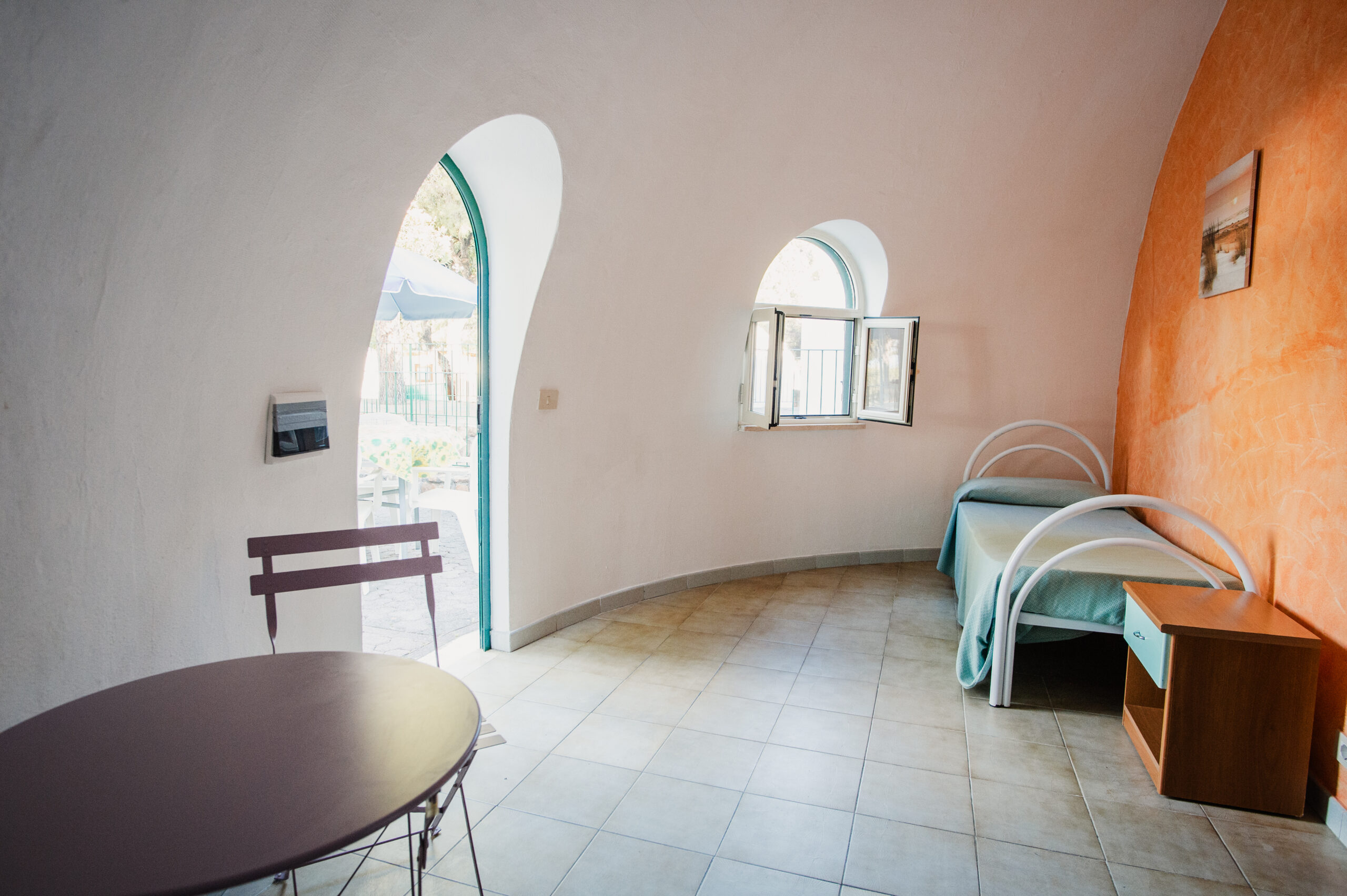 • I bungalow sono strutture in muratura a forma di igloo con una superficie di 25mq. Accoglienti e freschi in estate grazie alla loro forma particolare, possono ospitare fino a quattro persone. Dispongono di una zona giorno con divano letto o letto a castello, una camera matrimoniale, bagno privato con doccia e sono forniti di frigo e condizionatore. Non sono dotati di cucina.